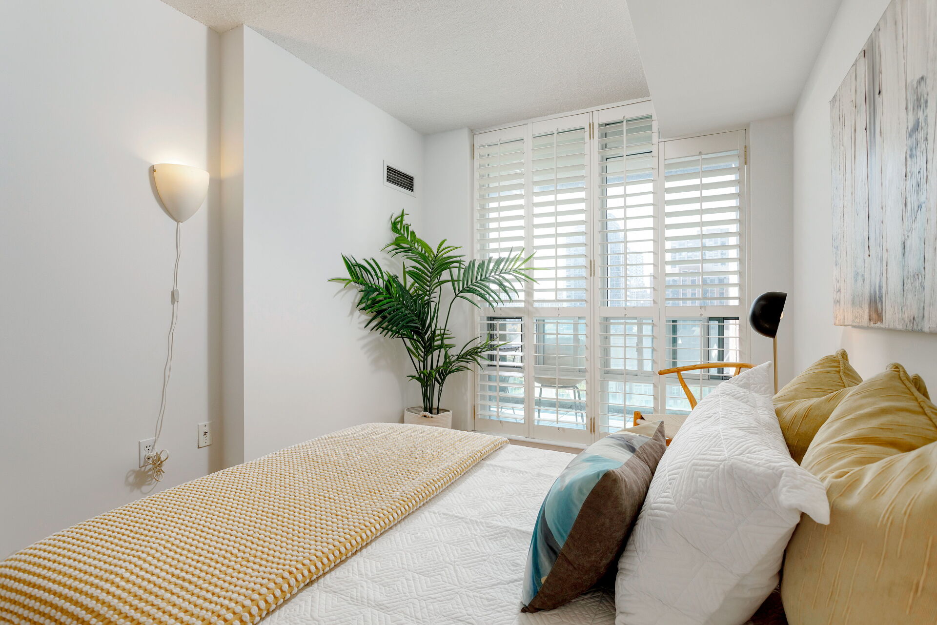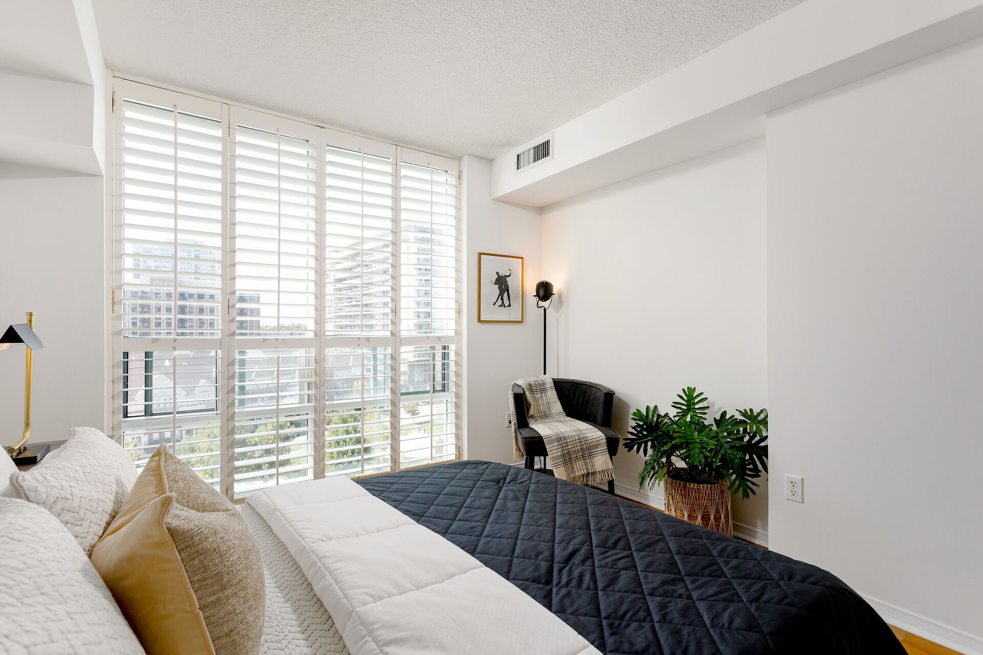 The renovated kitchen (2023) features stone countertops, stainless steel appliances, and a sleek design that makes both cooking and entertaining a pleasure. Both bedrooms are generously sized with double closets and private west views; the primary suite includes a 4-piece ensuite bath.